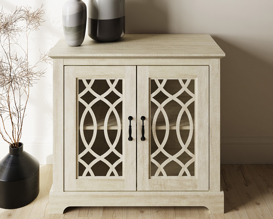 Statement Fretwork 2 door compact sideboard with colour washed oak finish & contrast metal handles. The Amelie collection, with its elegant fretwork detail doors, offers an undeniable sense of sophisticated yet bohemian style that is sure to inject character and personality into your home. The transparent doors further enhance the sense of space and dimension as the light changes throughout the day, providing both depth and reflection. Black metal pull handles offer a striking contrast to the colour-washed oak-effect finish and are a stylish finishing touch. Unleash your inner interior designer with these occasional pieces, designed to complement existing schemes and provide a considered and curated feel to your home décor.