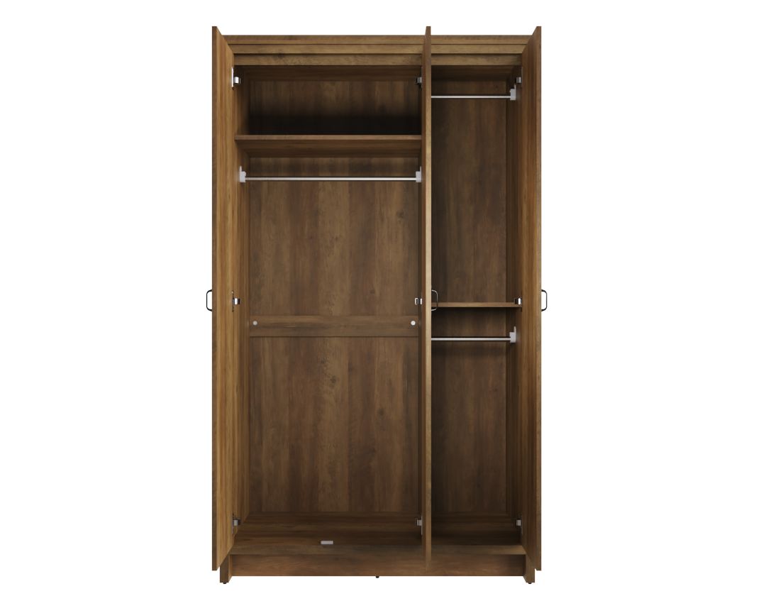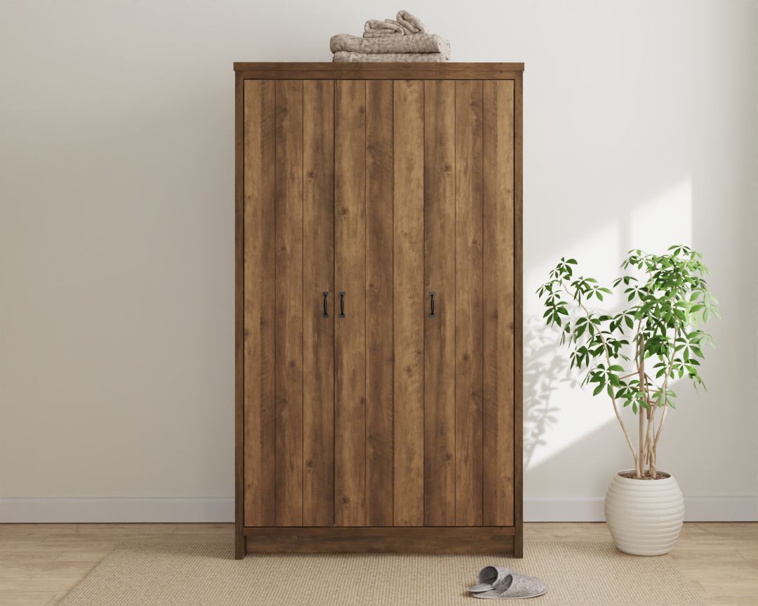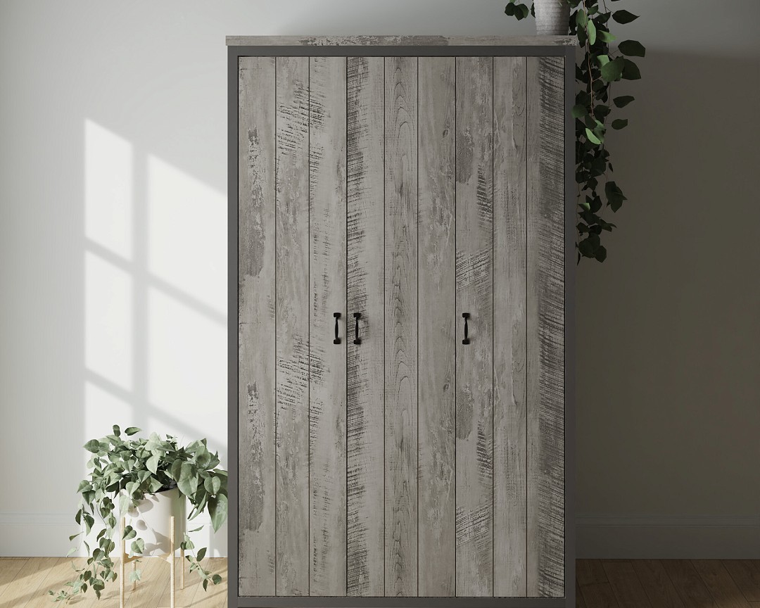 The Boston three-door wardrobe offers both hanging and shelf space allowing for both shoes and folded clothes to be stored away. The chunky panels – including 30mm tops – are neatly framed by the contrasting casing and accessorised by black metal handles that enhance the urban aesthetic perfect for your bedroom!