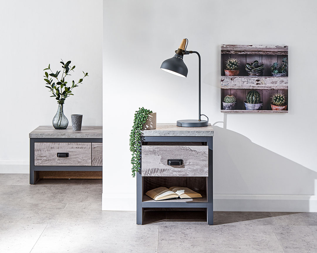 If you’re looking for a contemporary addition to your living space, this industrial-inspired lamp table is the savvy choice. Designed to bring a splash of urban chic into your home, it impresses with its chunky construction and distressed finish in oak or grey. The simple, double-sided design means it can be placed anywhere in the room; use it as an occasional drinks table or pair it with a smart lamp. Complete with deep drawer that has a matching wood-effect interior and 30mm thick top panel plus deep contrasting wooden casing.