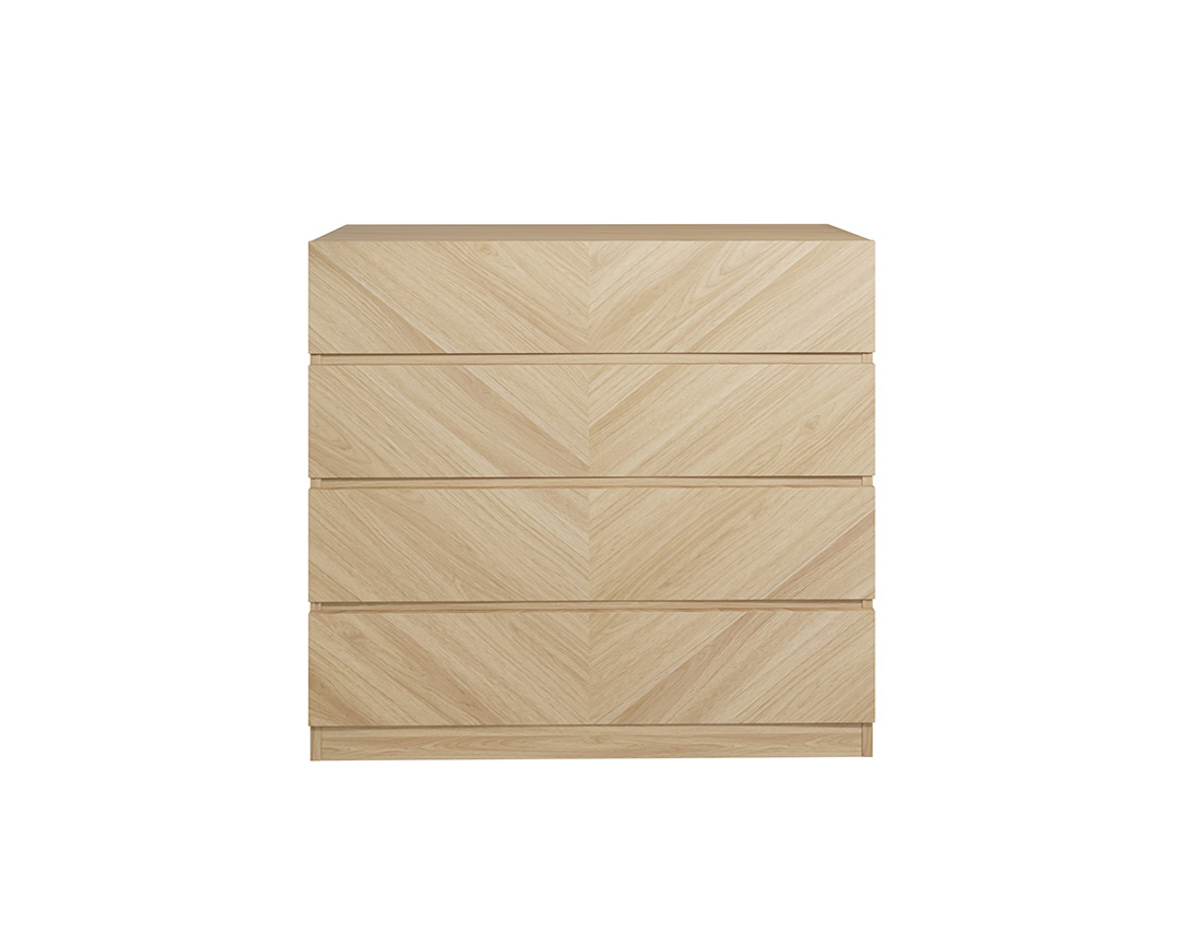 Delivering both style and practicality, this spacious full-width four drawer chest features Herringbone inspired wood-grain design drawer fronts which make a true statement in any room setting. The handle free drawer system opens smoothly on the metal runners providing plenty of storage space for all your personal items. This chest of drawers arrives ready to assemble with instructions included.