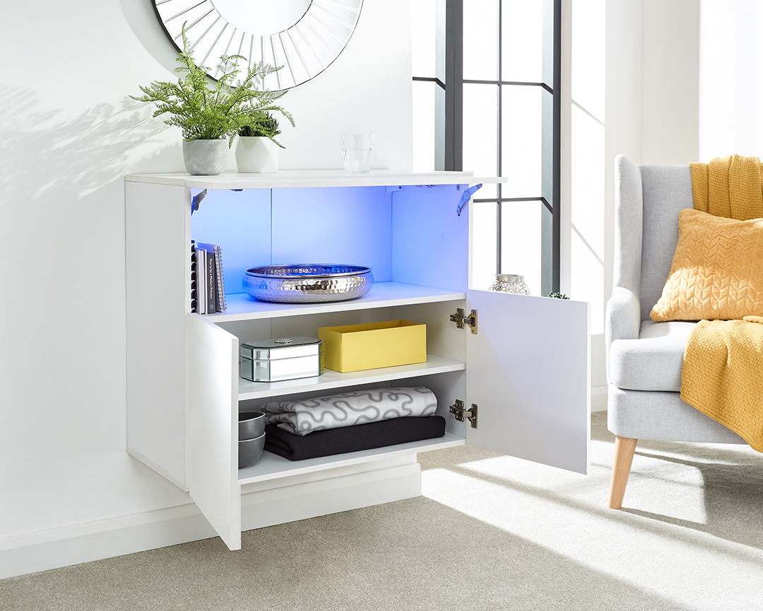 With Galicia, there’s simply no need to choose between form and function. The sleek and stylish design couples clean lines with wall-mounted construction to provide an off-the-floor storage option that helps keep your home clutter free. It offers plenty of space for equipment and accessories and a durable monochrome finish with high gloss feature panels in black, white or grey that will complement any modern interior. The twin-door cabinet is topped by a media shelf with a lift-up panel and a feature blue battery-powered LED downlight that accentuates the front slot.