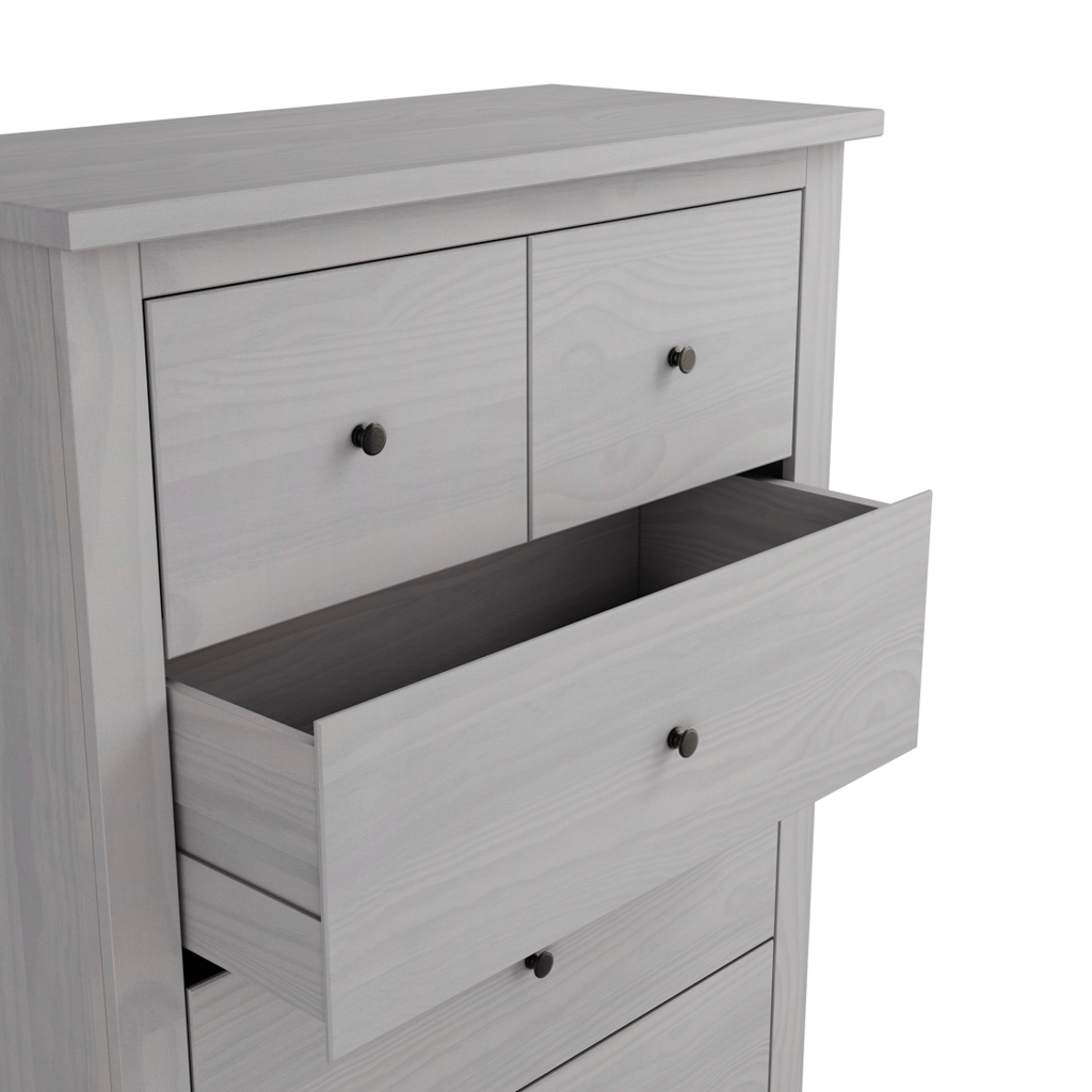 The Havana Grey Chest of drawers features a grey-washed pine finish and antique-style handles, providing ample storage with a versatile, neutral tone that suits any decor scheme. Crafted from solid wood, this chest combines functionality with a touch of classic charm.