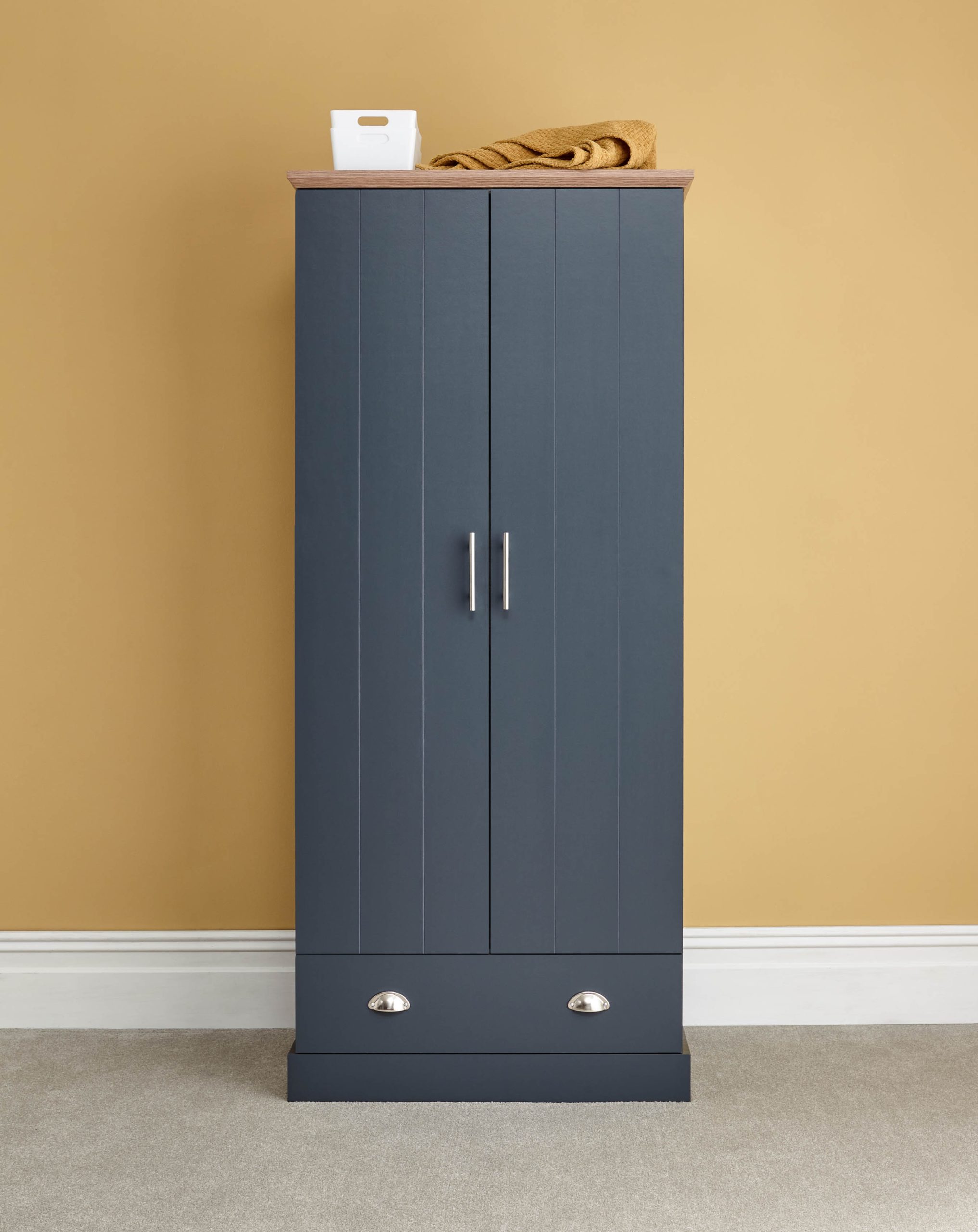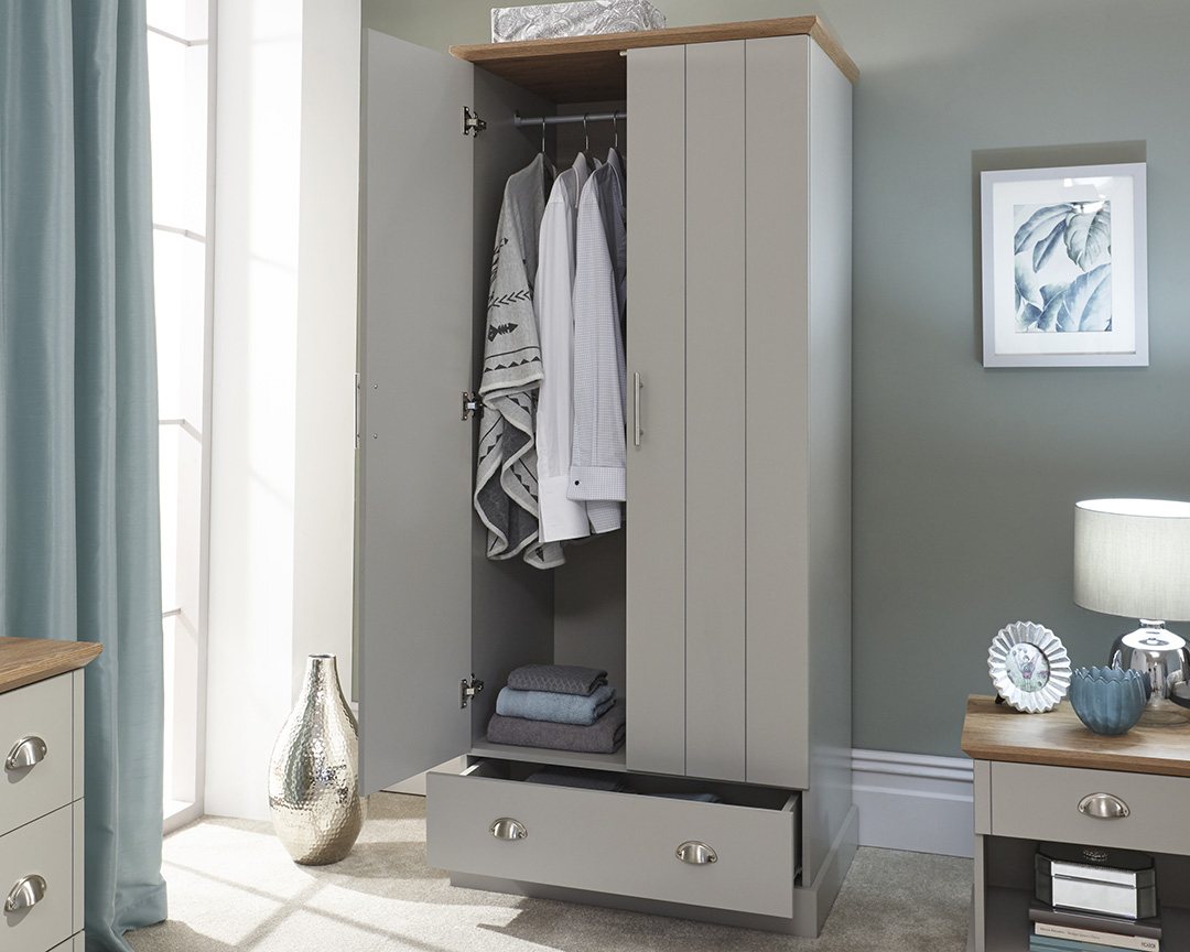 Kendal brings a touch of country cottage chic to any bedroom – this two-door wardrobe is a perfect example. The robust frame is mounted on a proud plinth and fitted with a pair of planked-style doors, incorporating a handy drawer beneath. The piece is finished in soft grey and finished with a bevelled oak-effect top that adds a natural contrast. Accessorised with brushed steel handles, it makes an elegant choice.