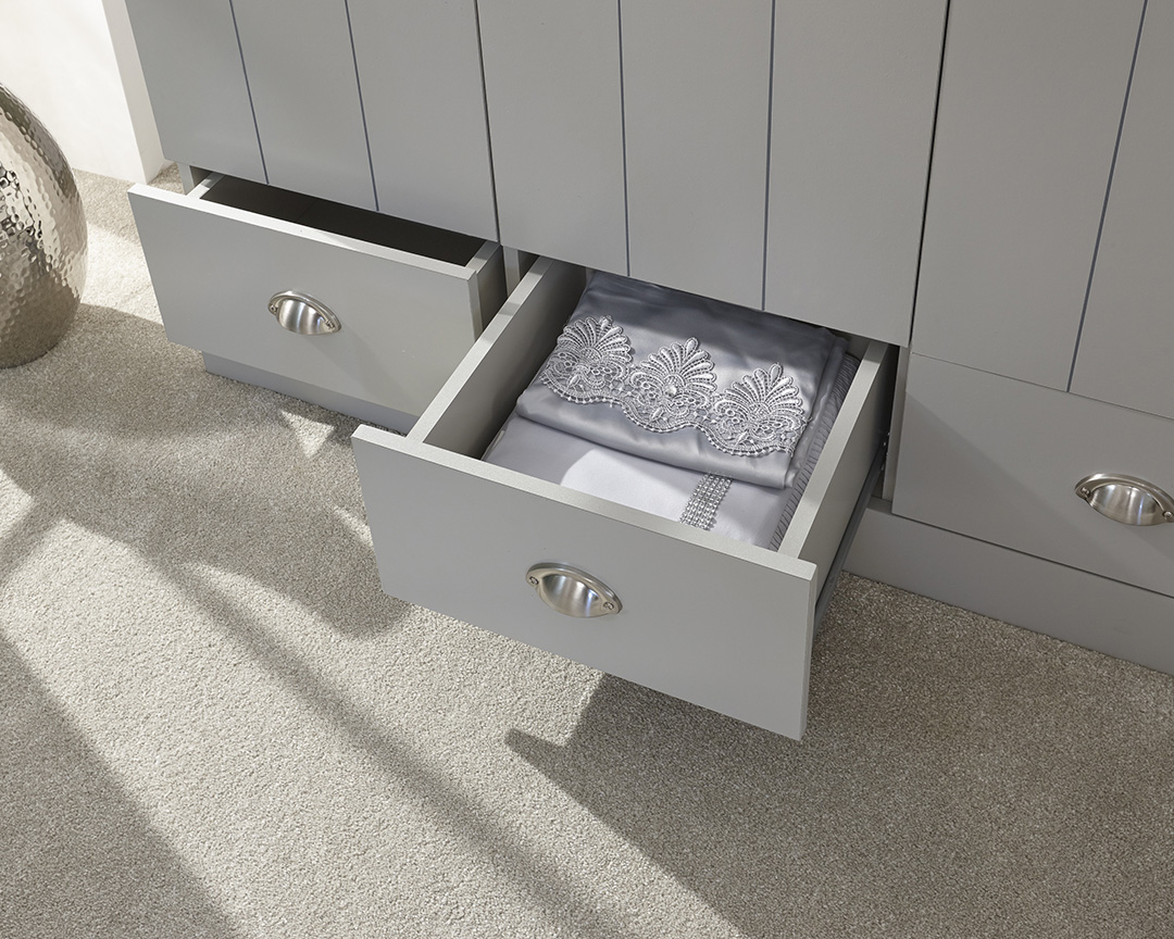 If you’d welcome a little more hanging space in your bedroom, this three-door wardrobe is a good option. Kendal’s country cottage-style feel adds a welcome touch of quality to any room, incorporating planked-style doors that open to reveal useful hanging space, accompanied by a handy trio of drawers beneath. The wardrobe is mounted on a deep base plinth and finished in a subtle shade of grey that tones with any colour scheme. The bevelled, oak-effect top and brushed steel handles complete the look.