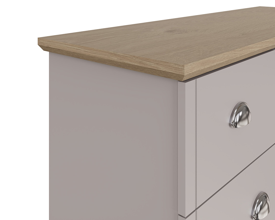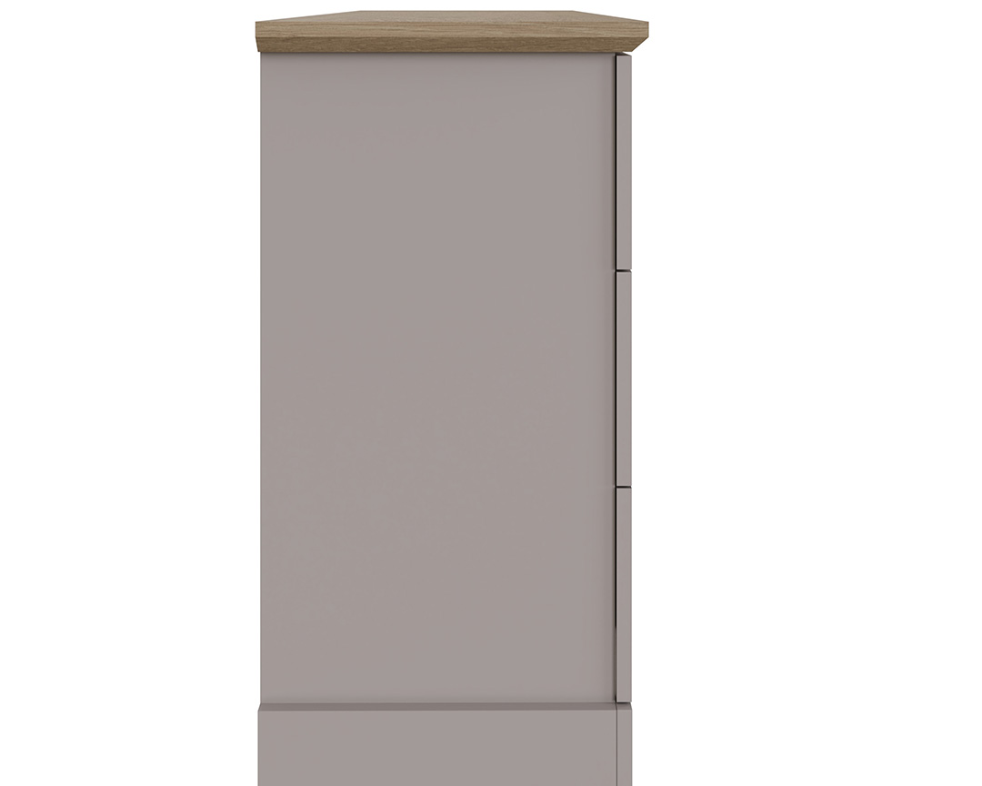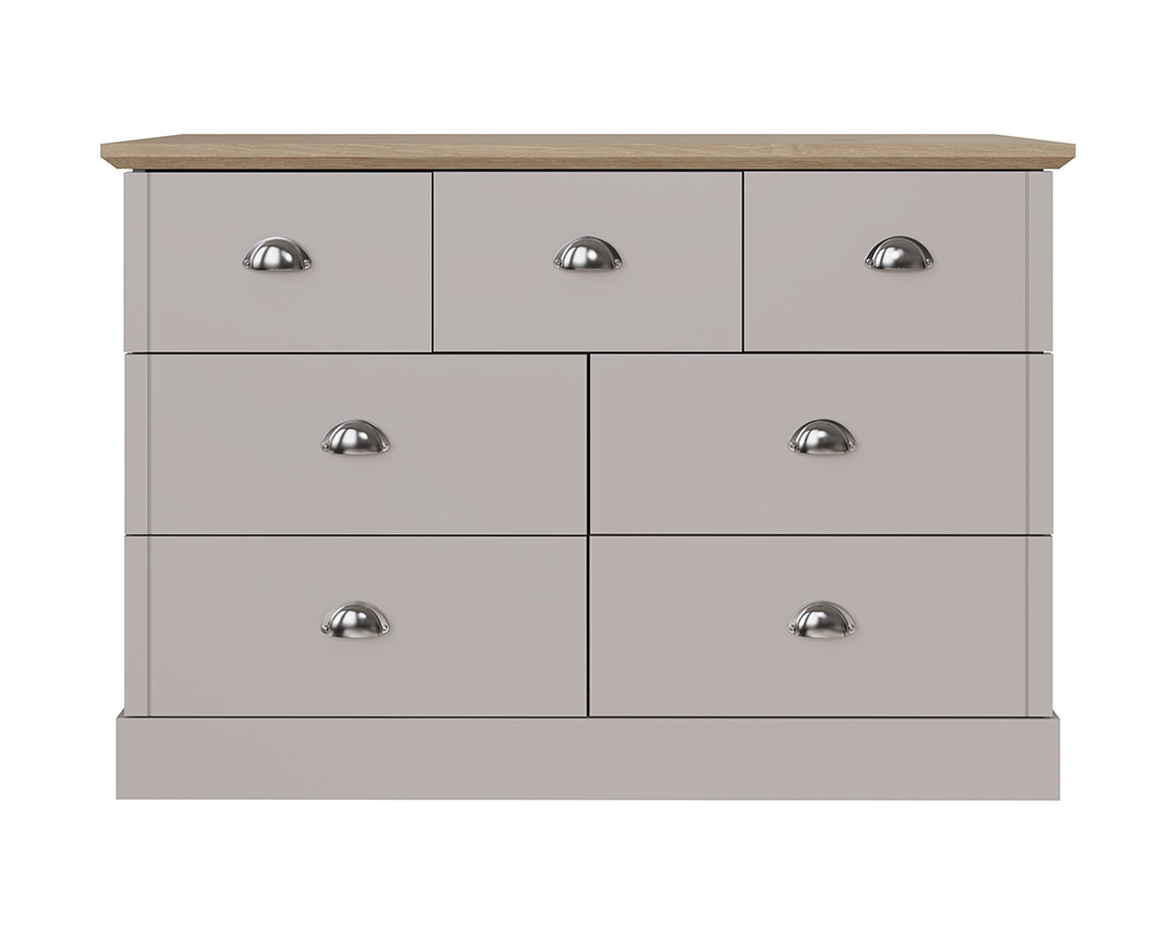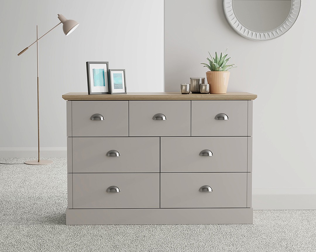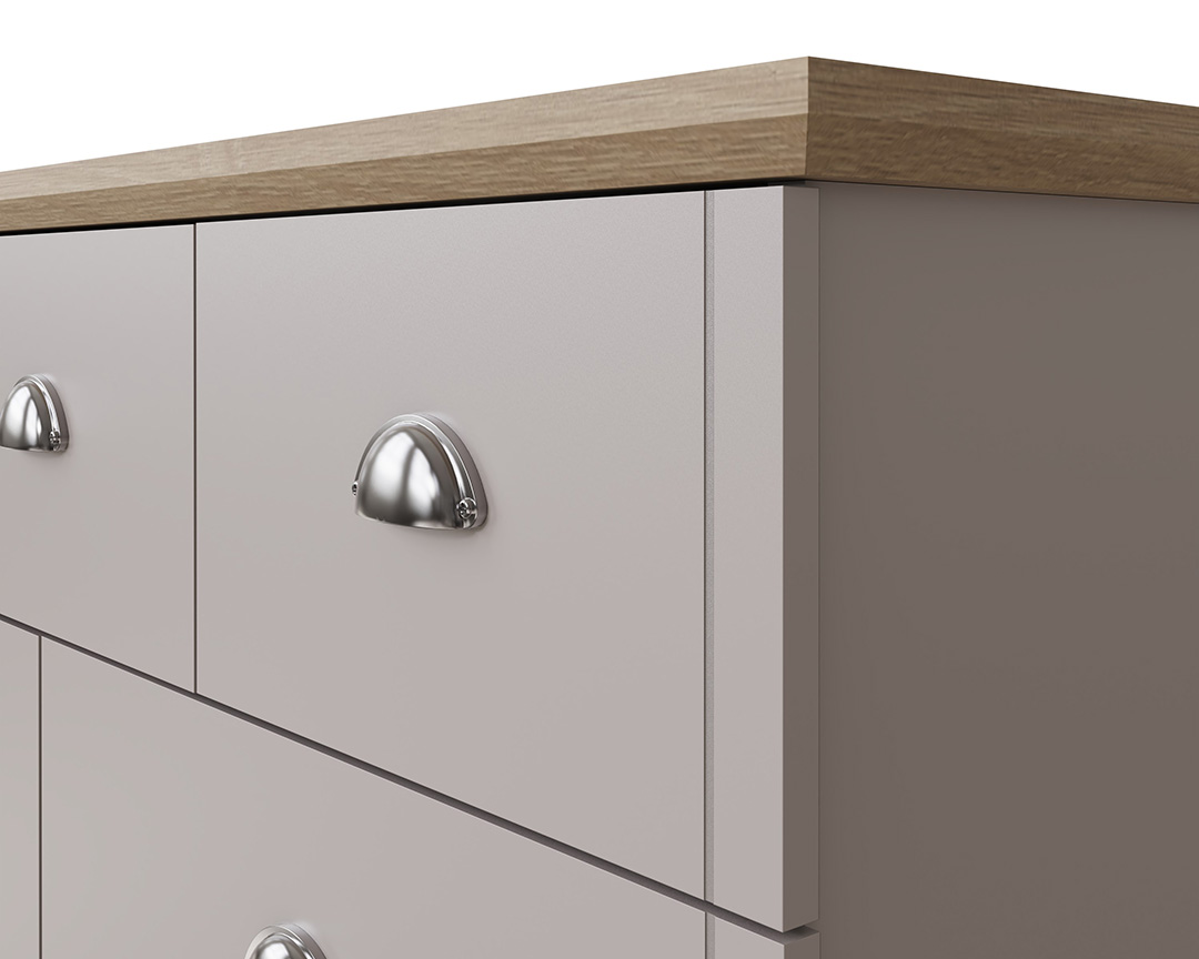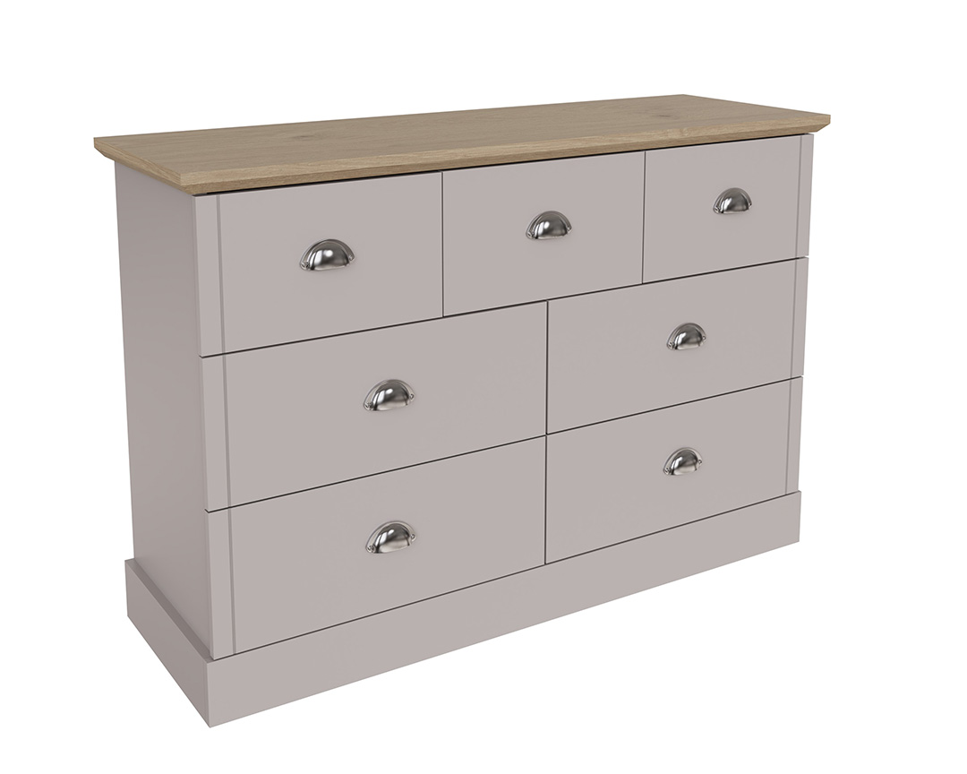 A wide storage solution of country cottage style, crafted with exceptional quality. This classic cabinet features a sturdy frame with three small drawers and four large drawers, all adorned with brushed steel cup handles, providing ample space to keep your items neatly organized – big or small. The entire cabinet boasts a sophisticated matte cool grey finish, complemented by a natural Oak woodgrain patterned top. Its design ensures a seamless fit, sitting directly on the floor with no gaps underneath, making cleaning hassle-free.