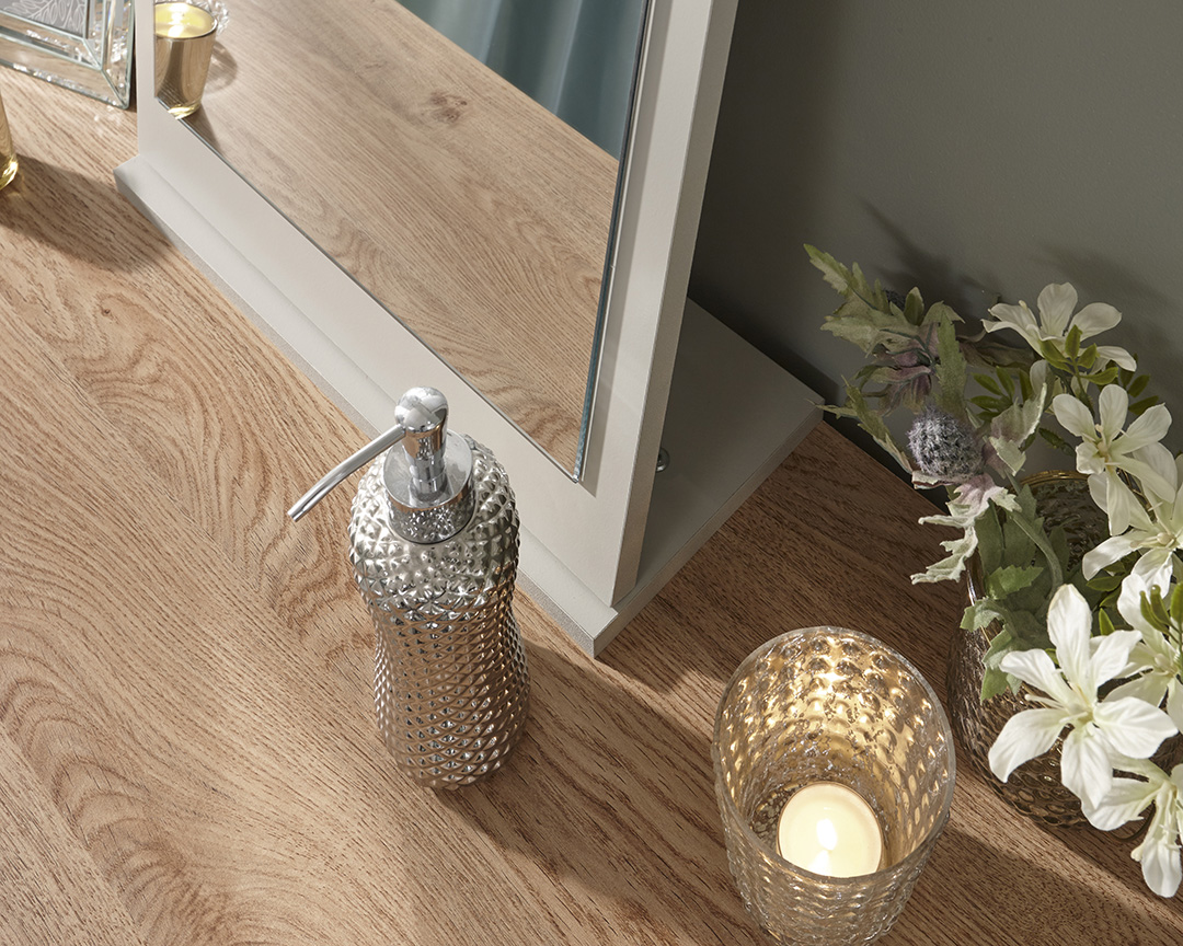 A versatile dressing table is always a smart choice for a bedroom, offering a handy repository for pots and potions and creating a one-stop station for hair and makeup. This cool Kendal set features a console-style table with integrated drawers and oak-effect top plus matching mirror and upholstered stool in soft grey. The stool tucks neatly away when not in use.
