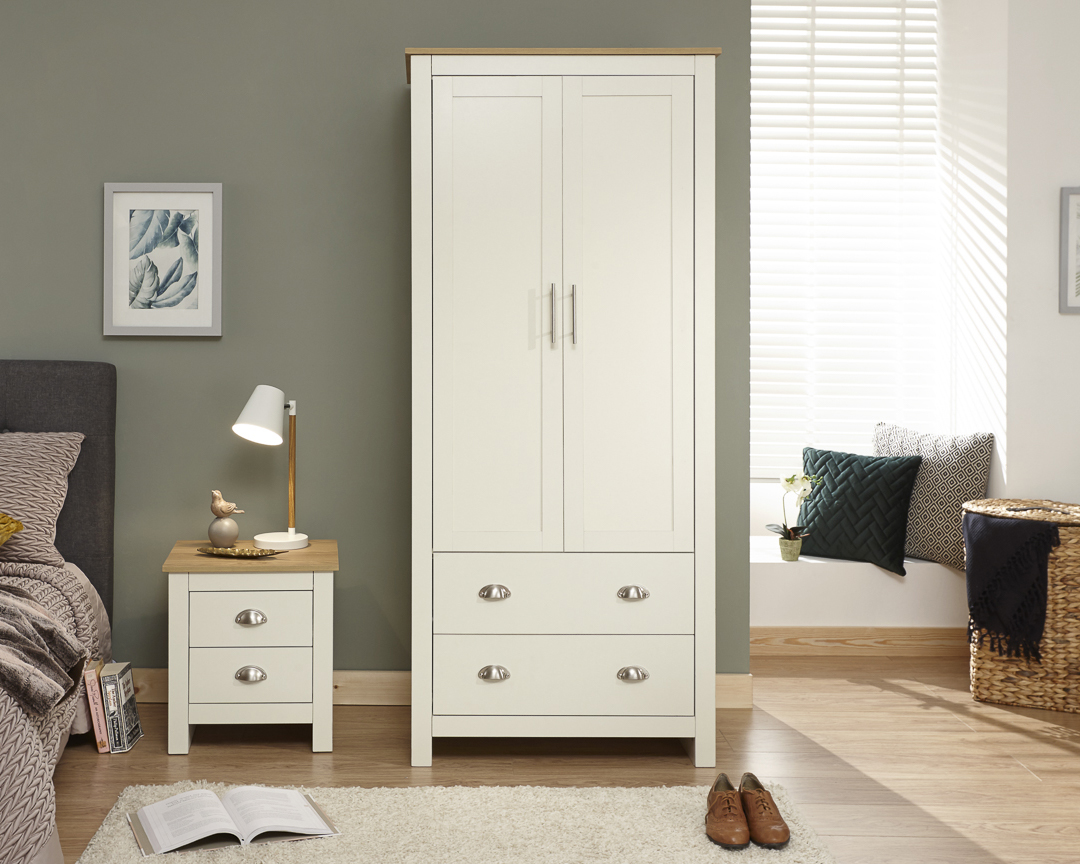 A stylish shaker-inspired wardrobe that’s perfect for kitting out a bedroom in first-class style. The sleek lines, soft grey or cream foiled finish with contrasting oak effect tops and brushed steel handles create a sophisticated impression. The wardrobe provides effective storage with a good mix of hanging, drawer and shelf space. Ideal for a room where understated elegance is the goal.