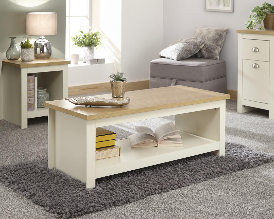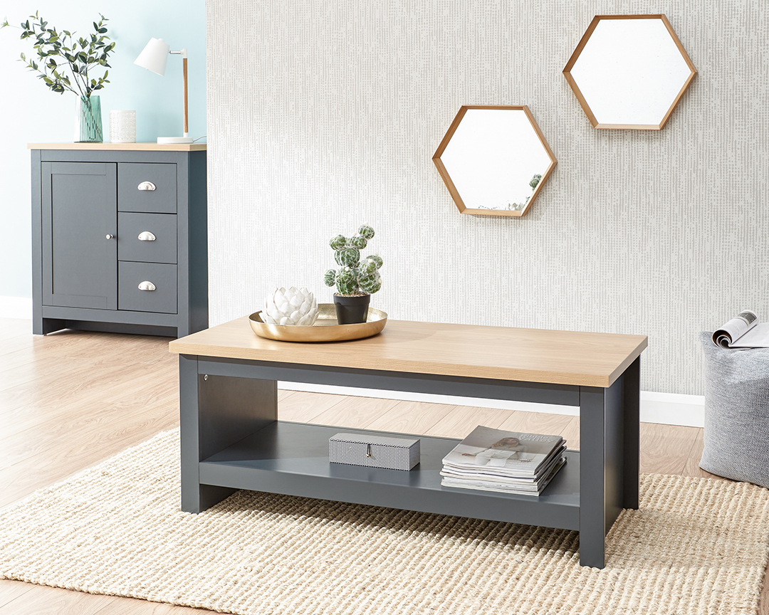 This simple Lancaster Coffee Table features a large lower shelf for storage. Like the rest of the Lancaster range it is available in a modern slate blue, soft grey or cream finish with contrasting oak effect top.