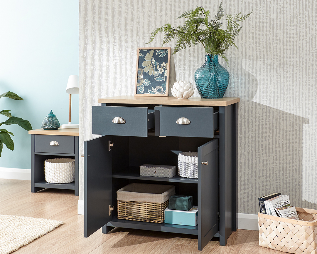 An elegant storage solution for the living or dining room. The Lancaster compact sideboard with its slate blue, matte grey or cream finish and contrasting oak effect top matches perfectly with the rest of the Lancaster range and features two handy drawers with satin silver handles and a spacious double door cupboard underneath fitted with satin silver knobs.