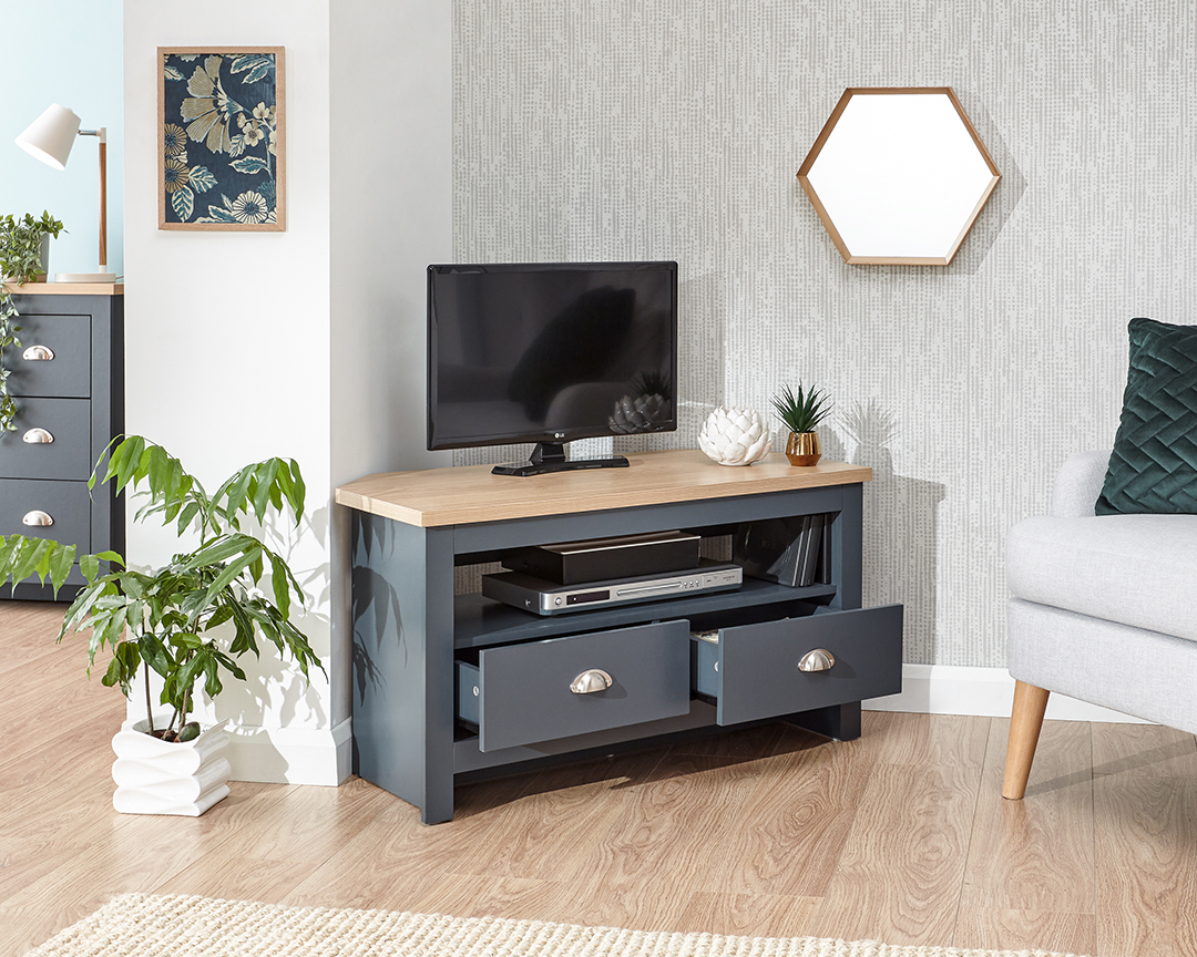 Our Lancaster Corner TV unit features a large shelf for all of your entertainment systems and 2 large storage drawers. Like the rest of the Lancaster range it is available in a modern slate blue, soft grey or cream finish with contrasting oak effect top, the two handy drawers on are fitted with satin silver drawer pulls.