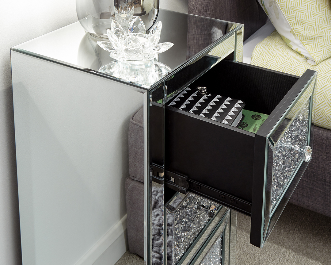 Bedside tables don’t come much more glamorous than this! Exuding Hollywood style, Lucia’s movie-star looks will enhance any bedroom, creating an illusion of space, thanks to the light-reflecting qualities. The frame is covered from head to toe in mirrored glass and mounted on elegant tapered legs. The drawer fronts are adorned with jewel-effect panels with coordinating multifaceted drawer knobs. The drawers enjoy ultra-smooth operation – thanks to the easy-glide bearing runners. Available in two- or three-drawer models to suit your space.