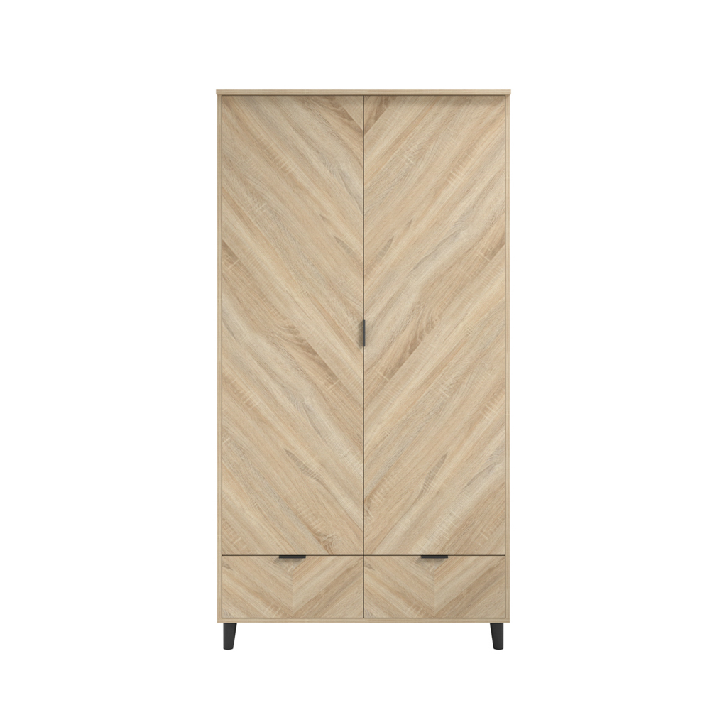 The Stockholm wardrobe is a sleek storage solution that combines modern design with functional elegance. Featuring a striking chevron pattern in Sonoma Oak, this wardrobe adds a touch of contemporary flair to any space. The matte black legs provide a subtle contrast, elevating its aesthetic appeal. With ample storage space and stylish design elements, the Stockholm wardrobe is the perfect addition to your bedroom or dressing area.